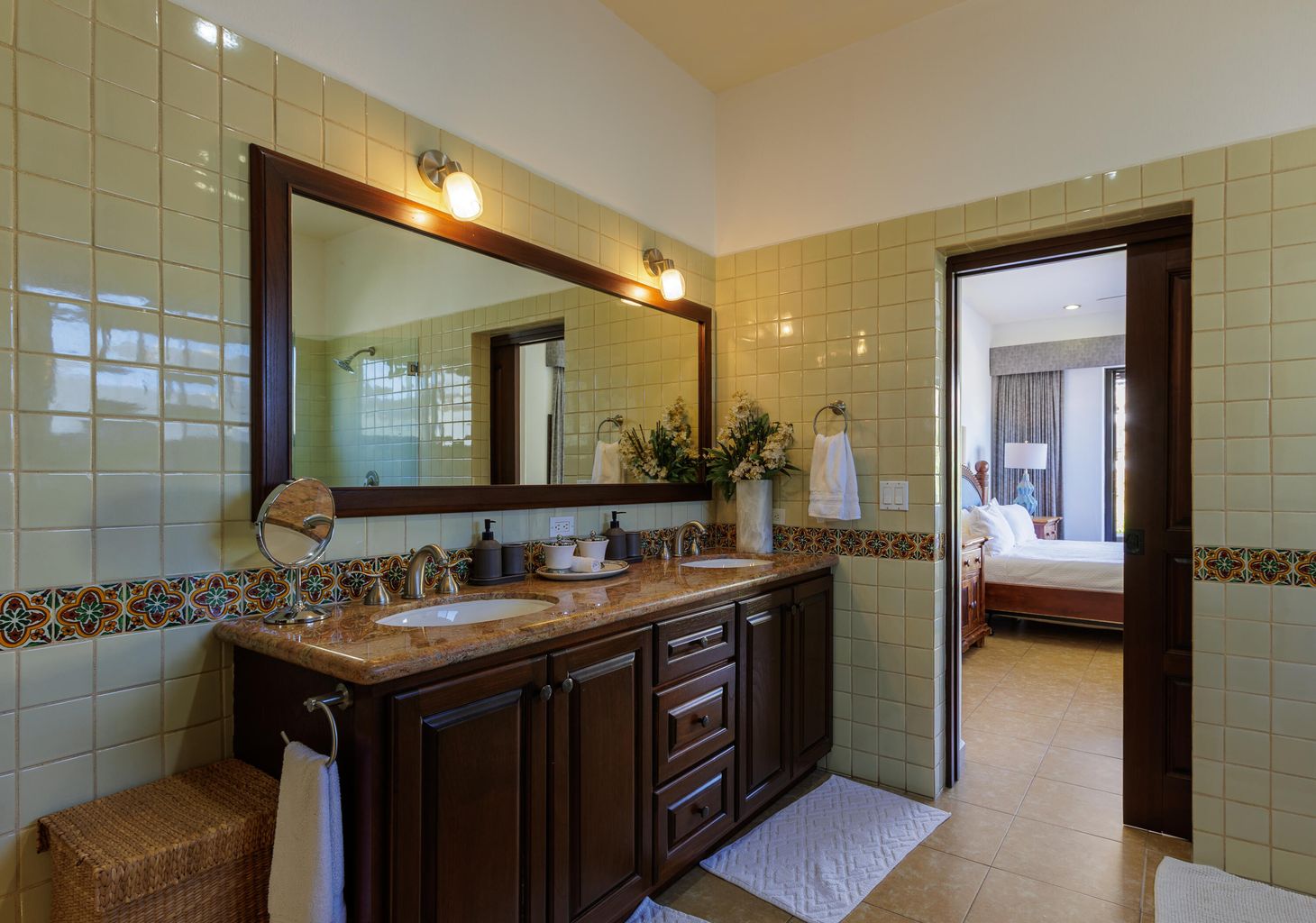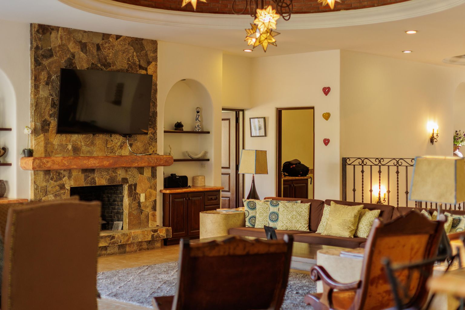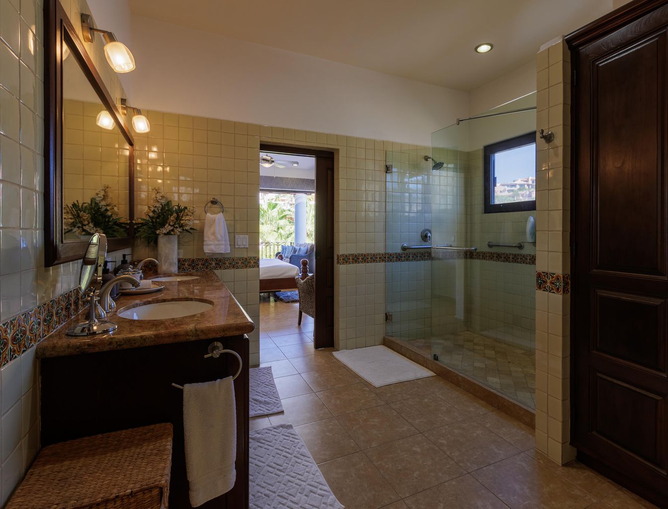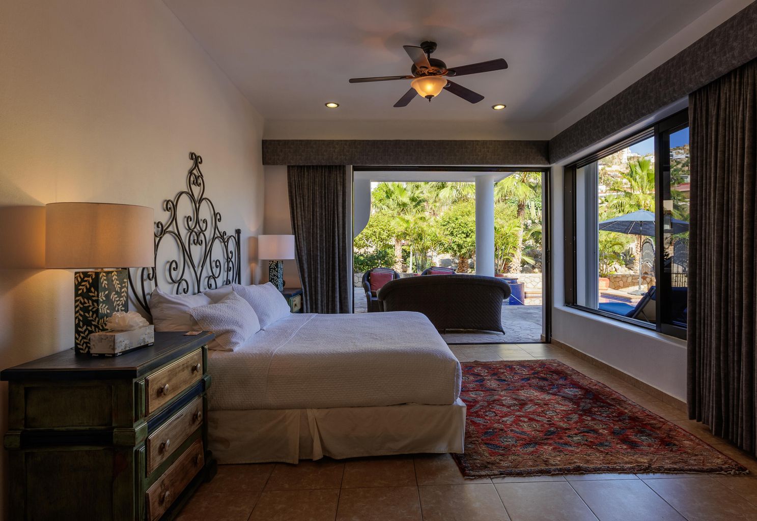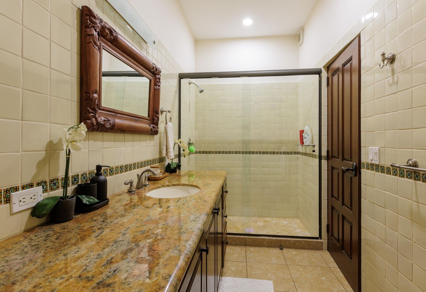 The lower level includes four guest suites, three with direct pool access, each with its own ensuite bath. Outdoor living highlights include a swimming pool, jetted spa, and spacious patio with sun and shade. A unique rock bridge provides direct access to the private Pedregalito Park with a 25m lap pool, palapa, and lounge area.