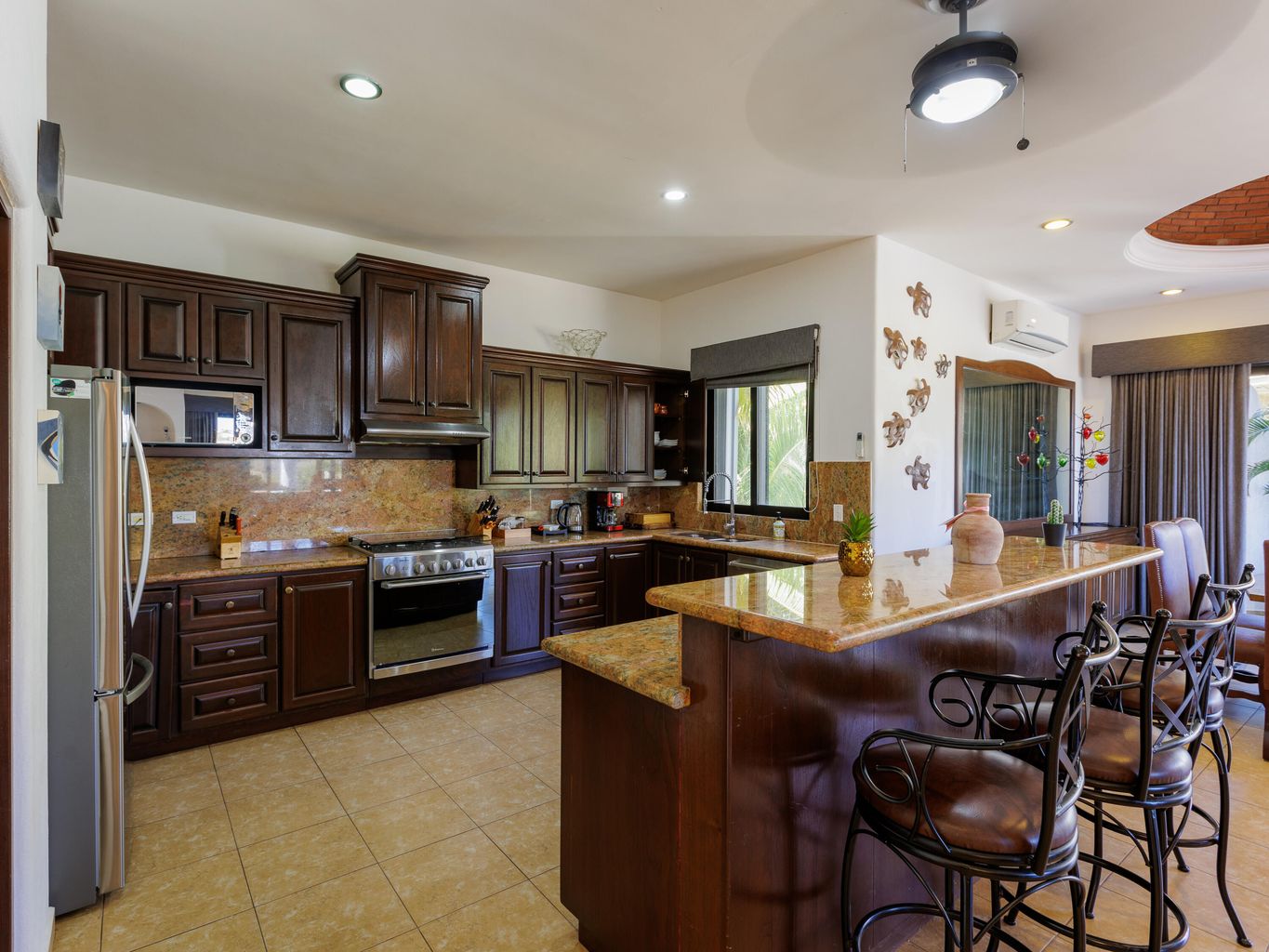 The main level features an open-concept kitchen, dining, and living area that opens to an expansive ocean-view terrace overlooking the private pool. The primary suite is also located on this level and offers terrace access, an ensuite bath with dual vanities, walk-in shower, and a lockable walk-in closet.
