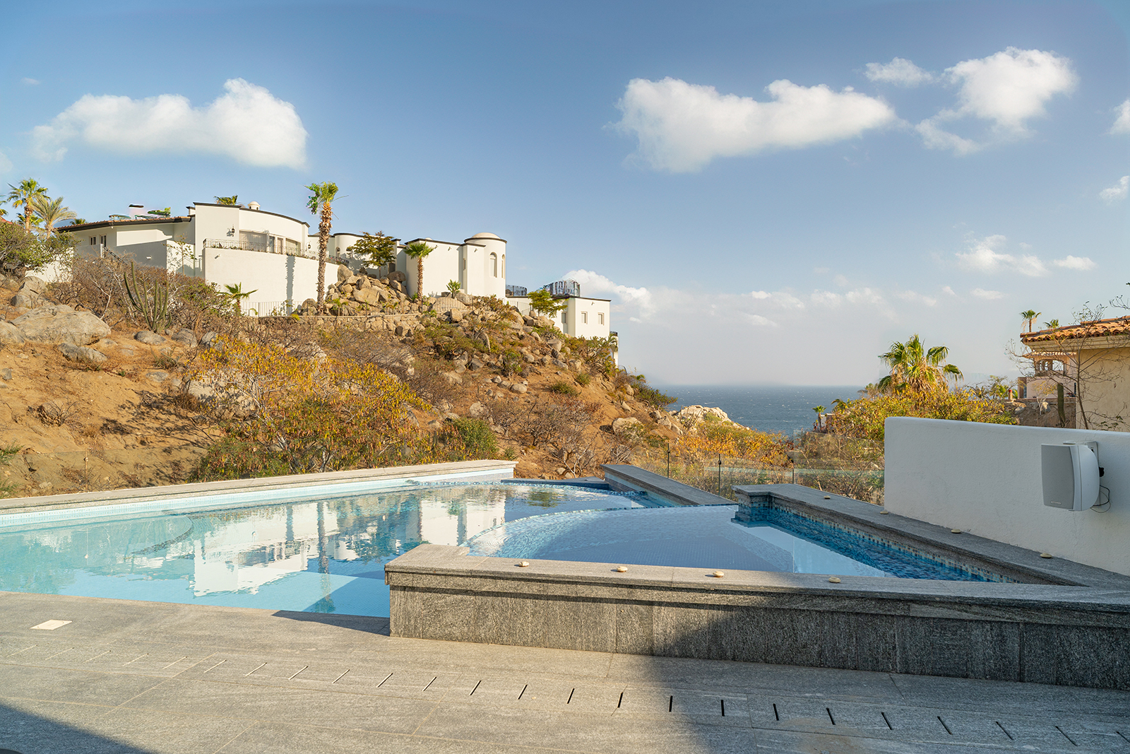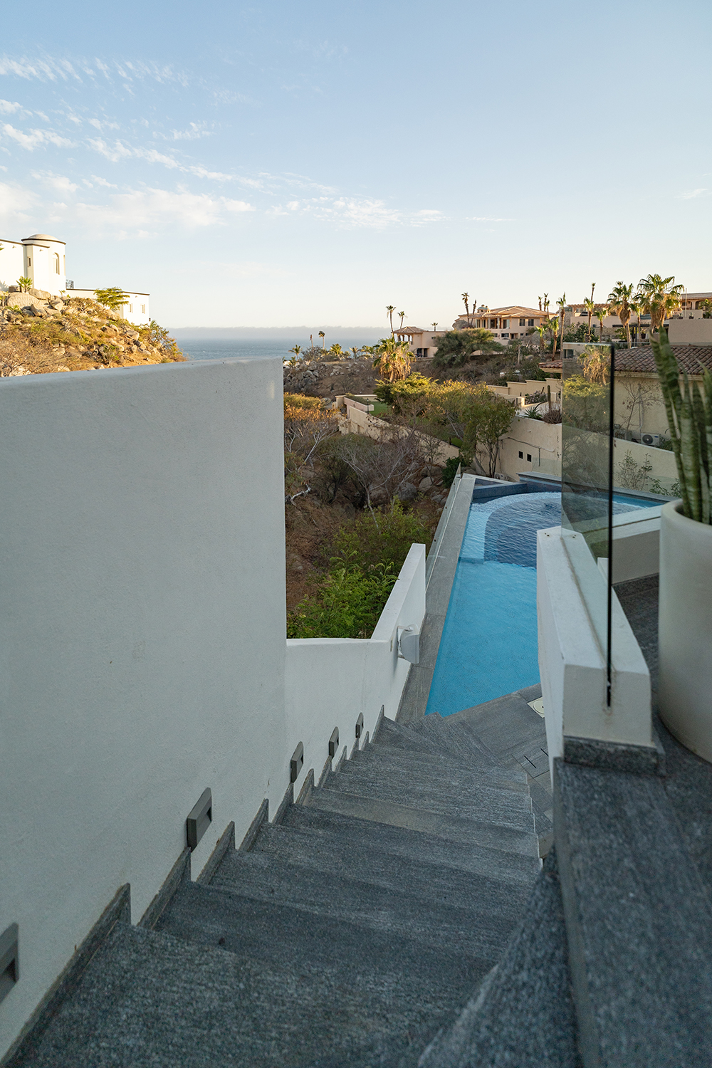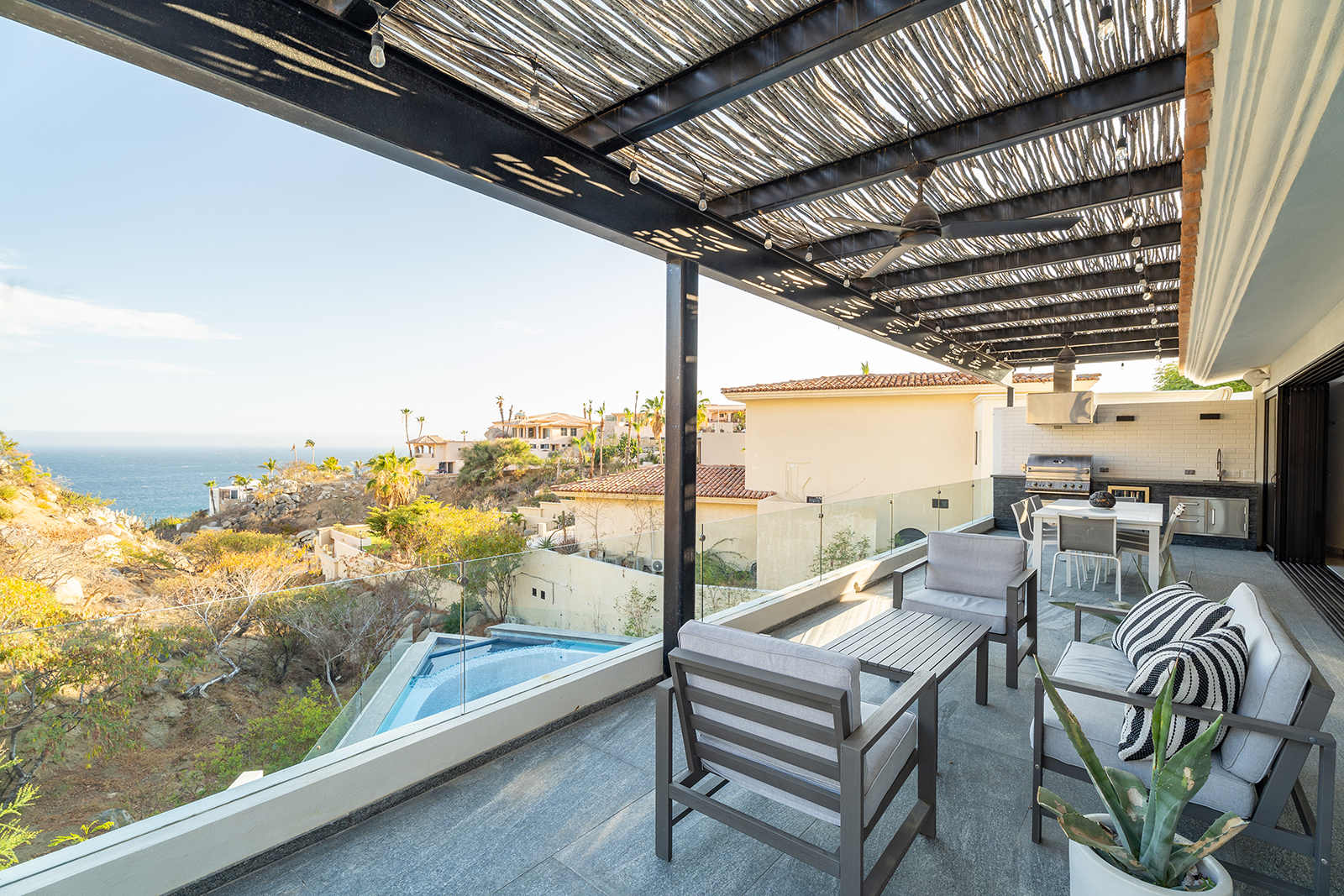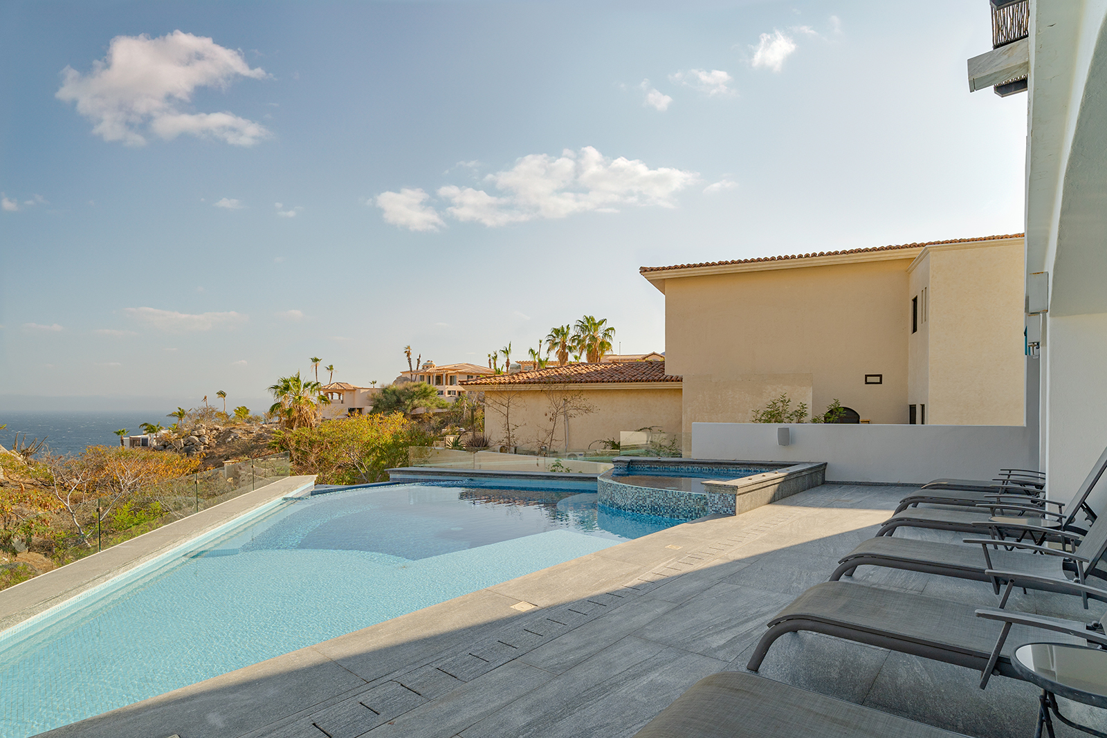 Discover the epitome of elegance at Casa Nido del Mar, a secluded haven perched on the Pacific side of Pedregal Hills. This luxurious property perfectly combines indoor and outdoor living through its spacious, open-concept design. The two-story living area, framed by floor-to-ceiling glass balcony walls, delivers stunning ocean views from every corner. Entertain guests on the sprawling terrace, or simply relax and take in the panoramic ocean views from every room. Featuring 4 bedrooms, 4 bathrooms, and 3,2002 sq. ft. of refined living space, Casa Nido del Mar boasts a large pool with serene valley views that cascade toward the Pacific Ocean, offering a peaceful escape.