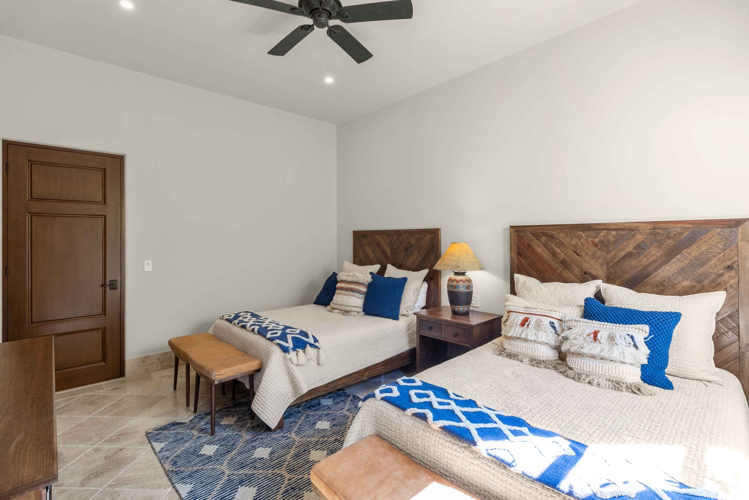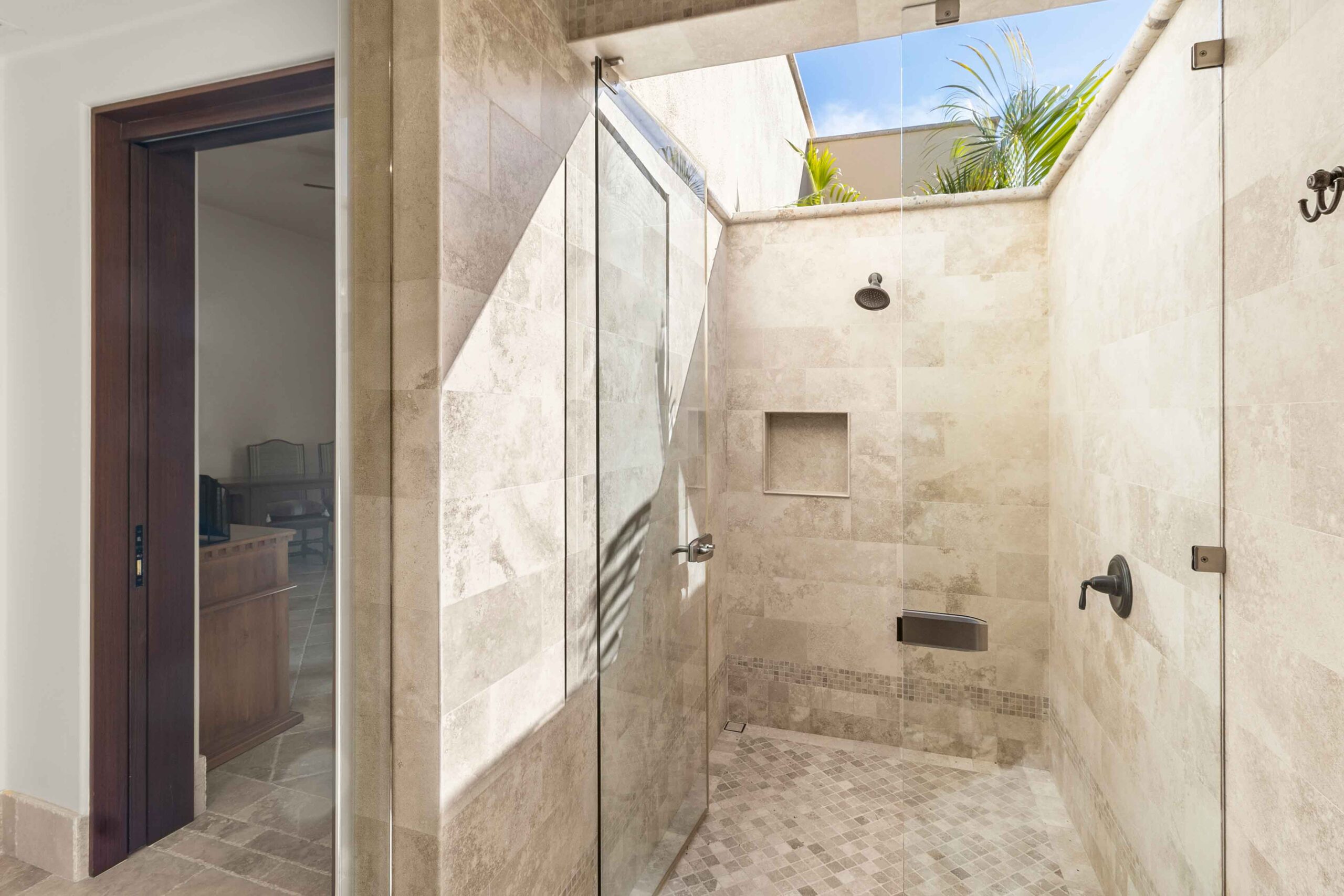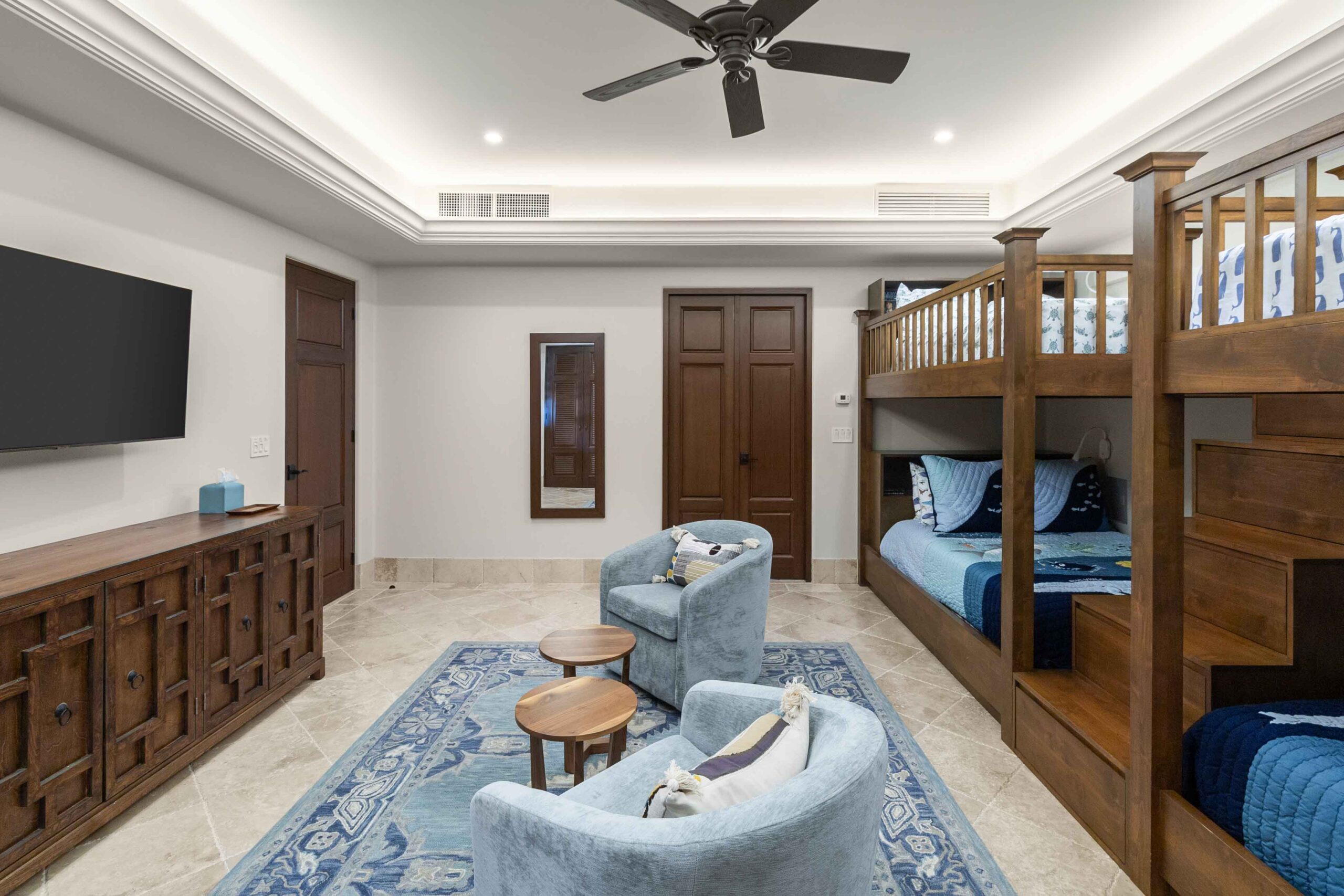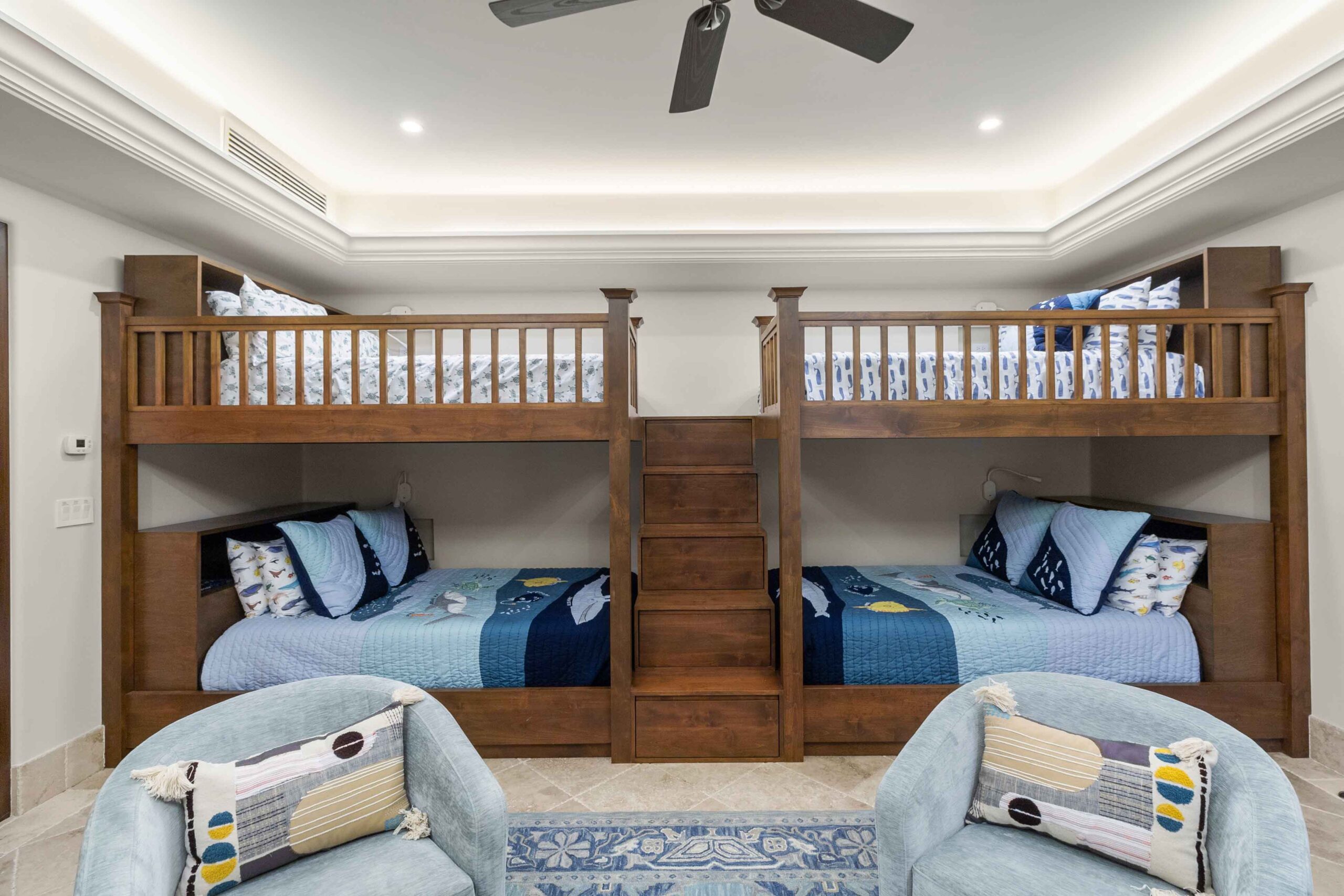 Luxurious Bedrooms: The two Primary Bedroom suites each offer direct access to pool deck, separate closet/dressing areas, large Jacuzzi tubs, and dual indoor/outdoor showers. The three additional bedrooms, all have access to the Courtyard; two have ensuite bathrooms with dual indoor/outdoor showers, one of which is equipped as a versatile office/ home gym space. The bunk bedroom, tailored for kids, offers four full-sized bunk beds, with adjacent full bathroom.