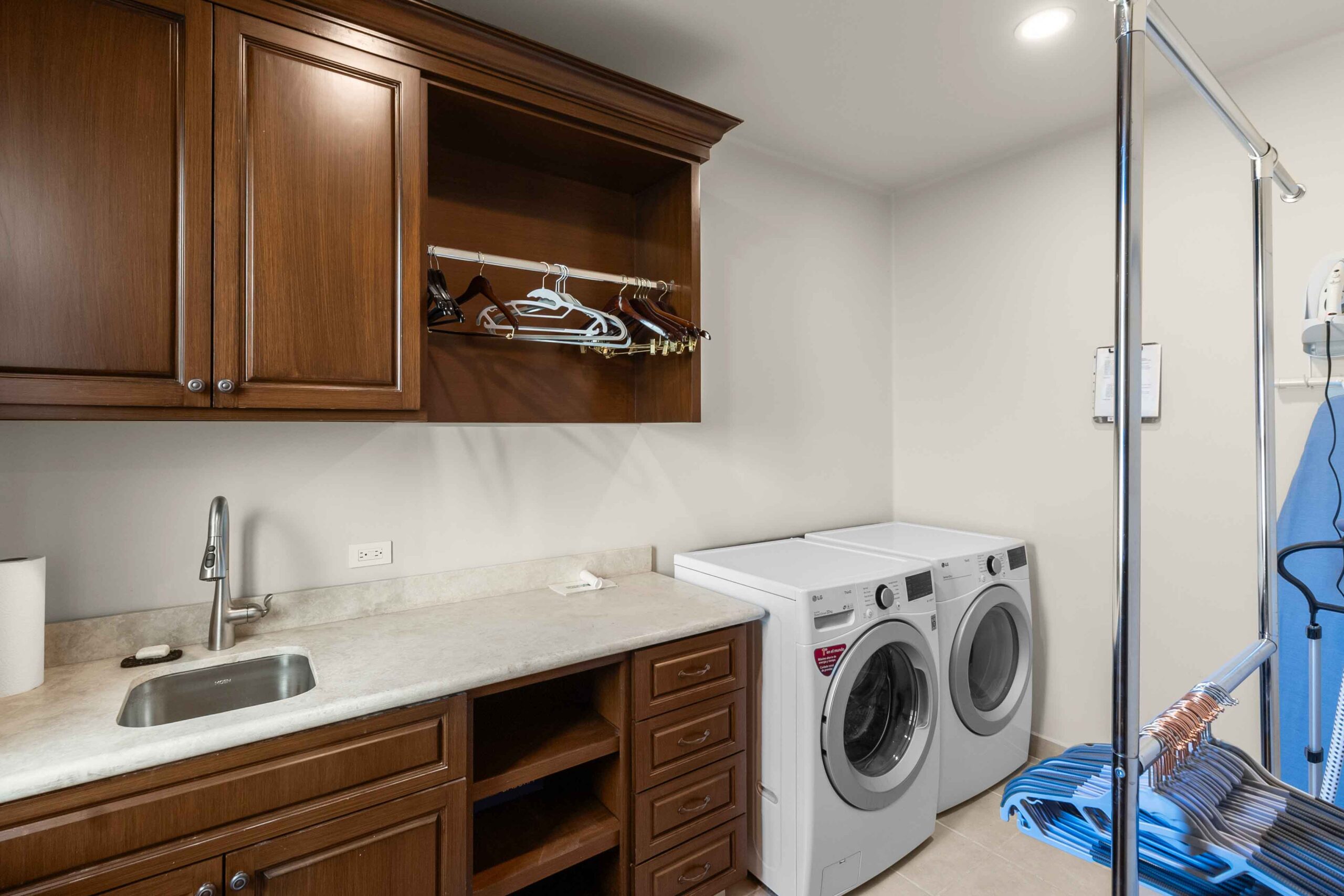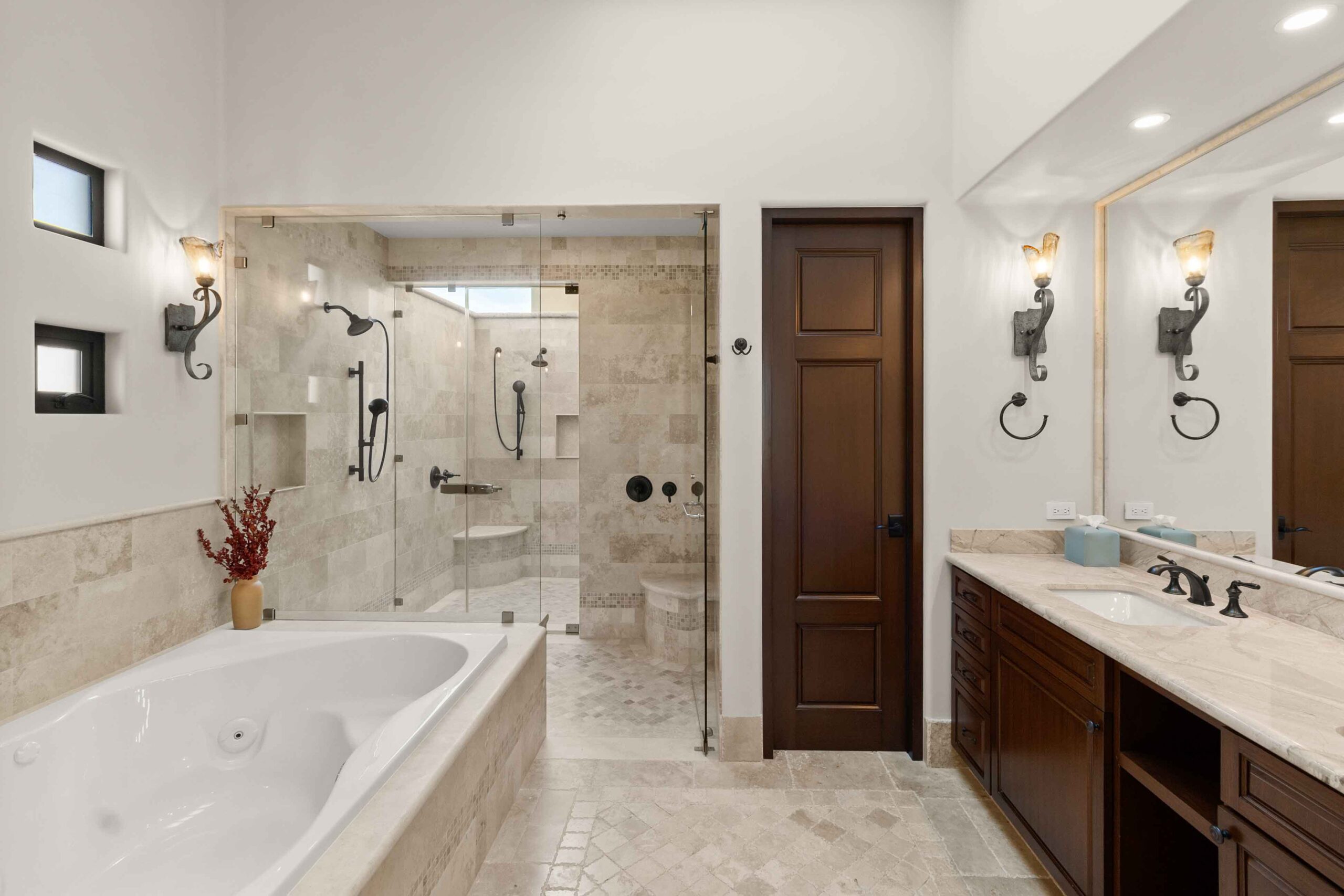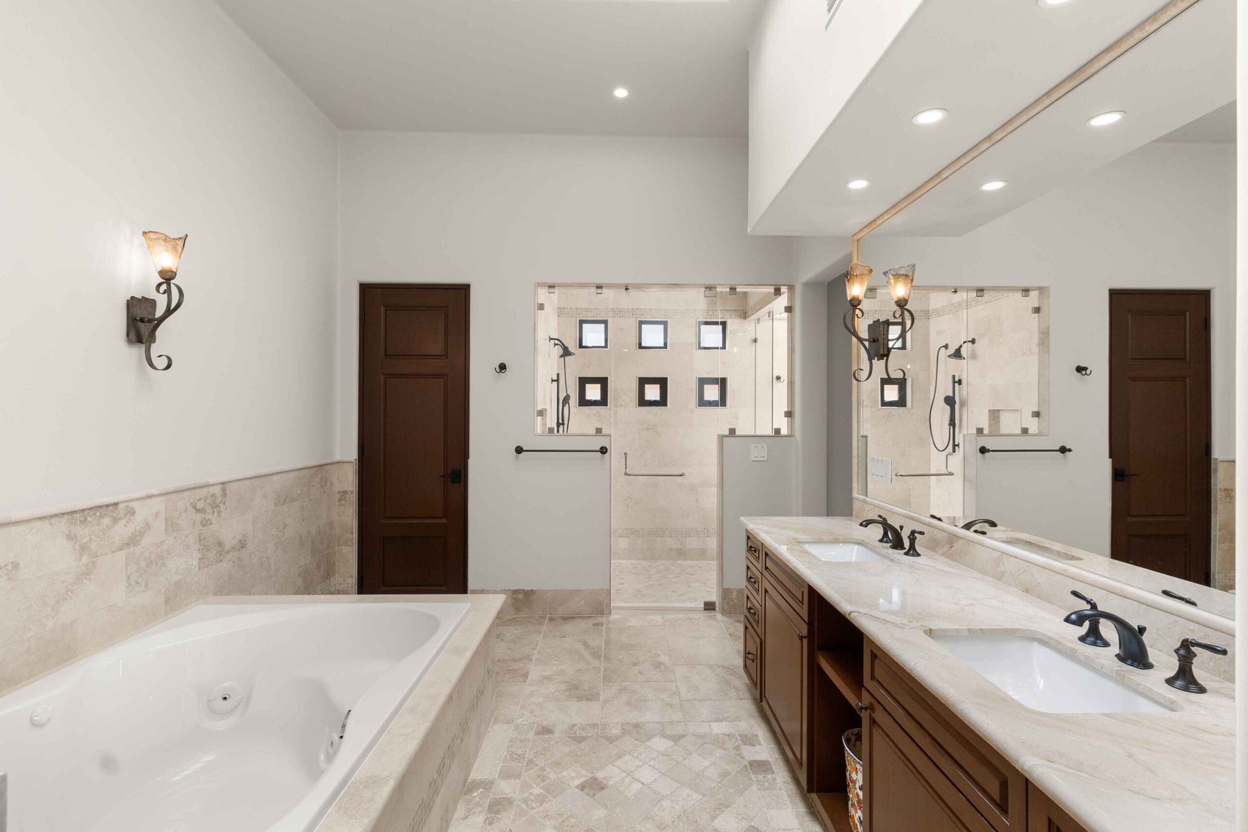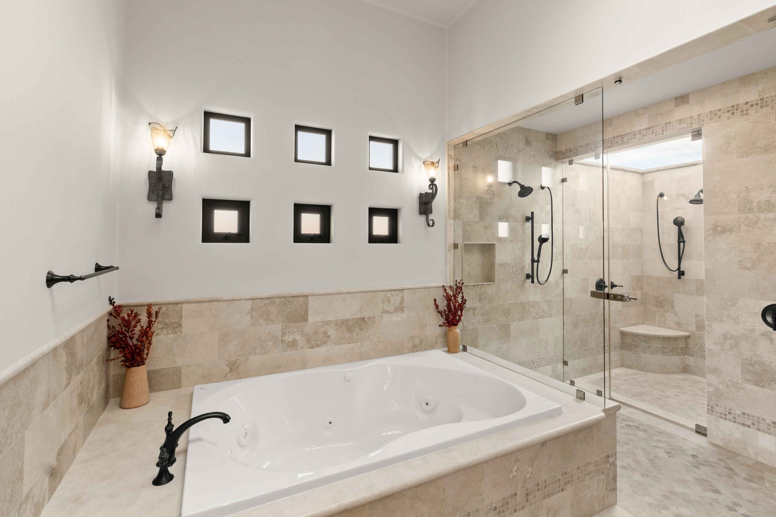 Luxurious Bedrooms: The two Primary Bedroom suites each offer direct access to pool deck, separate closet/dressing areas, large Jacuzzi tubs, and dual indoor/outdoor showers. The three additional bedrooms, all have access to the Courtyard; two have ensuite bathrooms with dual indoor/outdoor showers, one of which is equipped as a versatile office/ home gym space. The bunk bedroom, tailored for kids, offers four full-sized bunk beds, with adjacent full bathroom.
