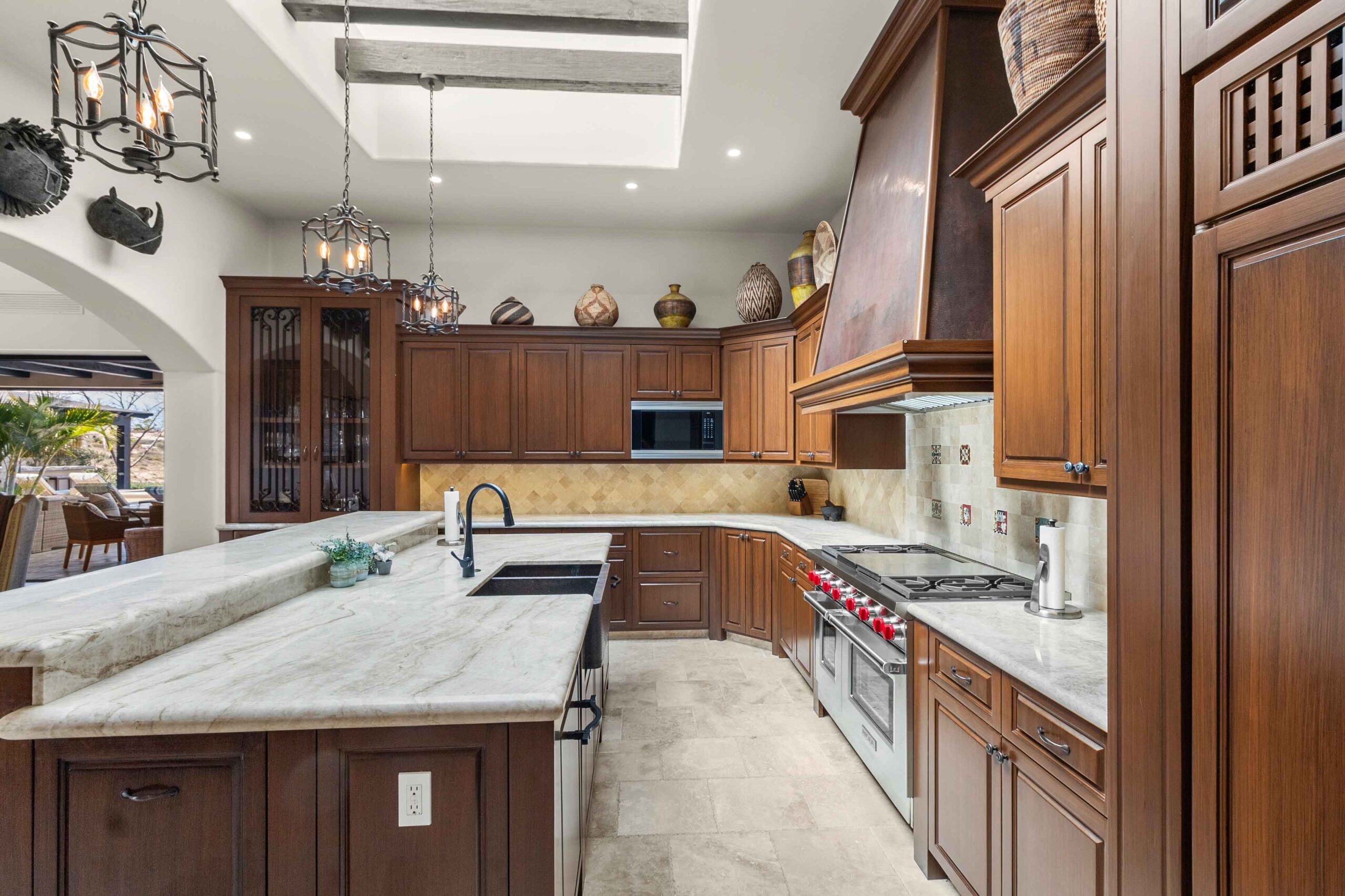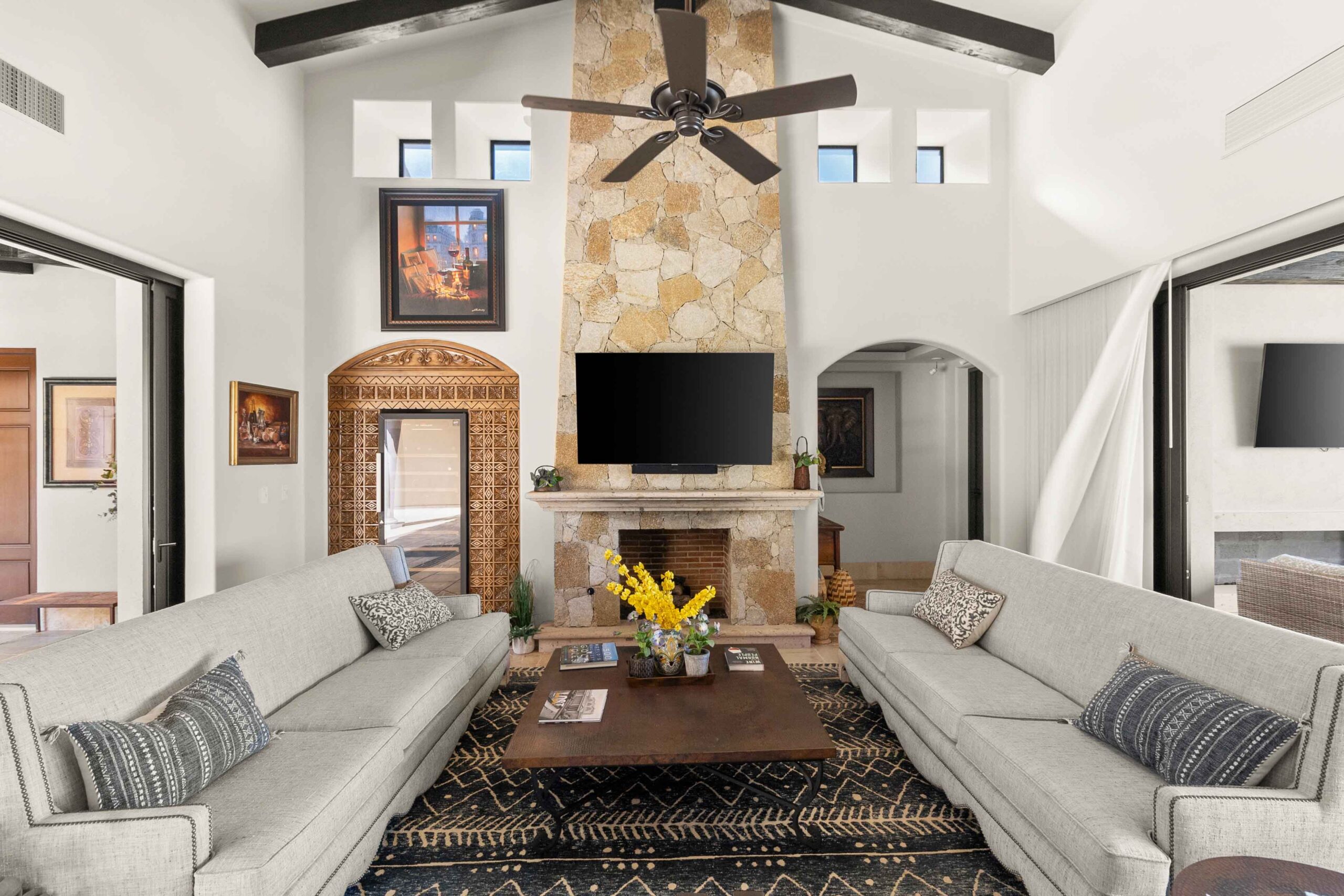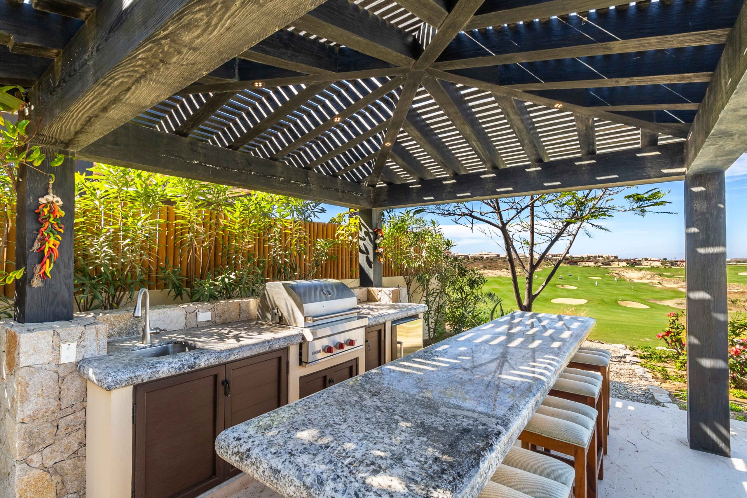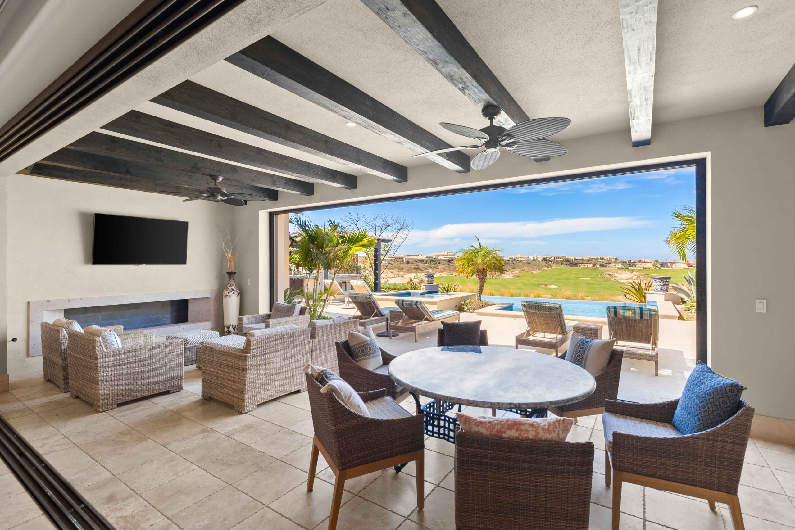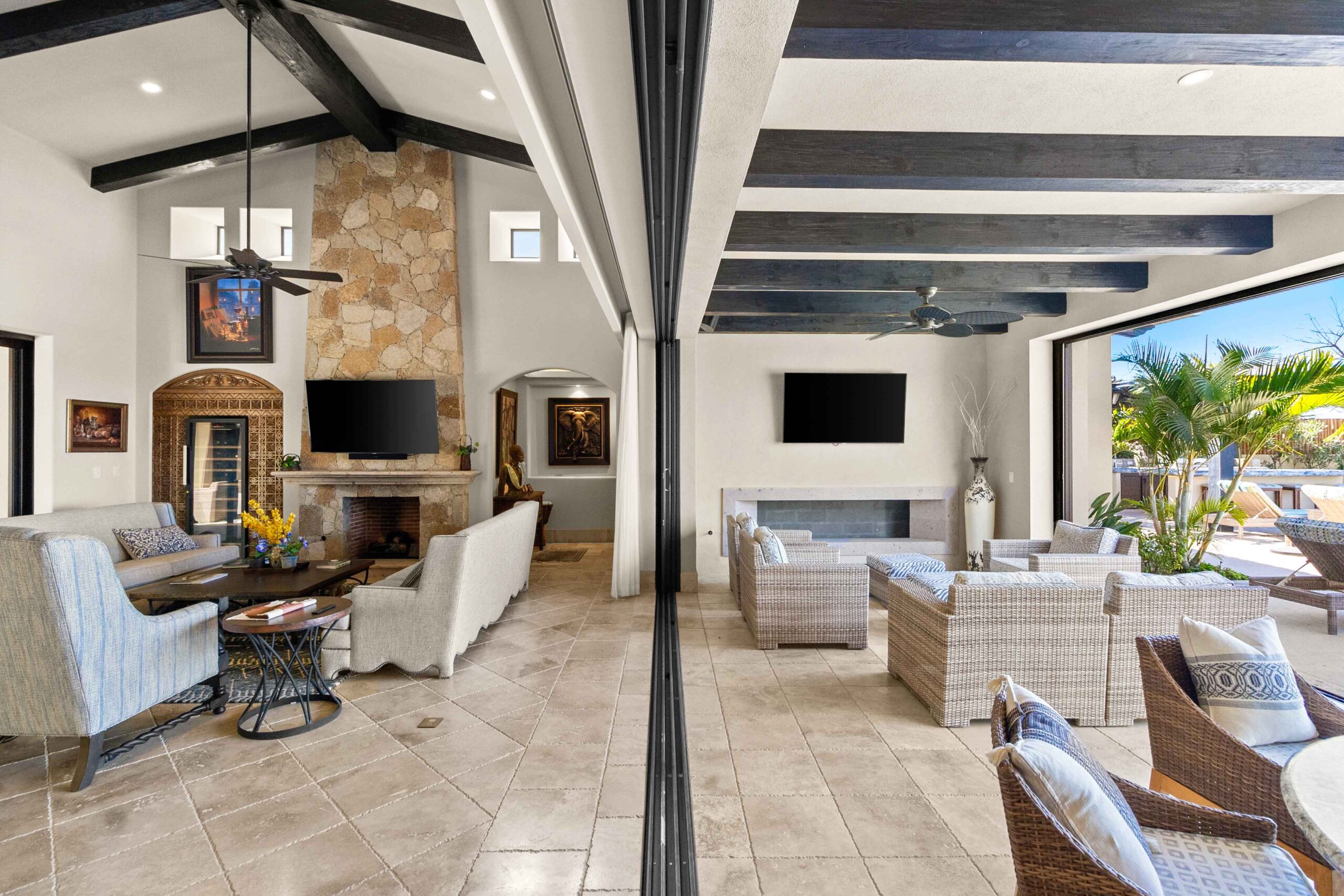 Outdoor Living: Additional dining and entertainment areas flow from Great Room to Covered Terrace, furnished with 8-top granite dining table, adjacent TV area with seating and large fireplace. Adjoining the pool deck is a seated fire pit, and pergola-covered galley kitchenette, with BBQ grill, and double-sided granite bar. The Upper Deck offers additional seating, tiled bar with sink and fridge, and birds eye views of pool deck, Dunes driving range, and construction of the new Legacy Golf Course. Plus magnificent sunsets!