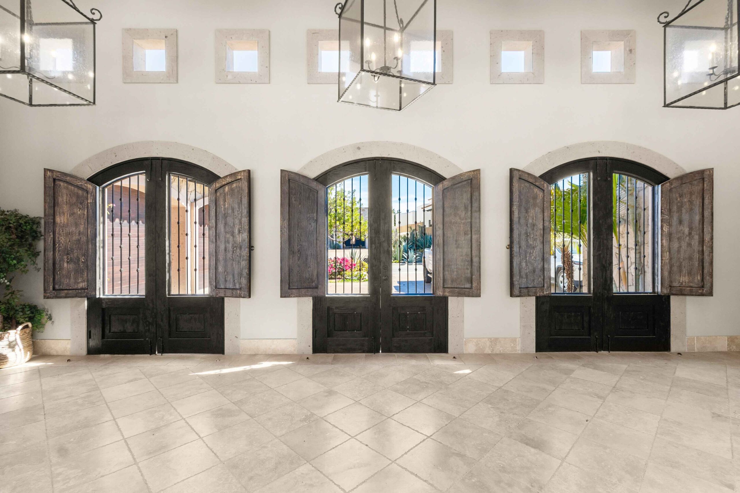 Grand Entrance: three sets of double-doors, with arched window shutters and spindles, open to the interior courtyard, all key elements of traditional hacienda architecture. The furnished courtyard offers a large cabinet-mounted TV, gas firepit, doorways to 3 bedrooms, glass pocket-doors to the Great Room, and a visual thruway into the covered terrace, pool deck, driving range, and beyond to the sunset sky!