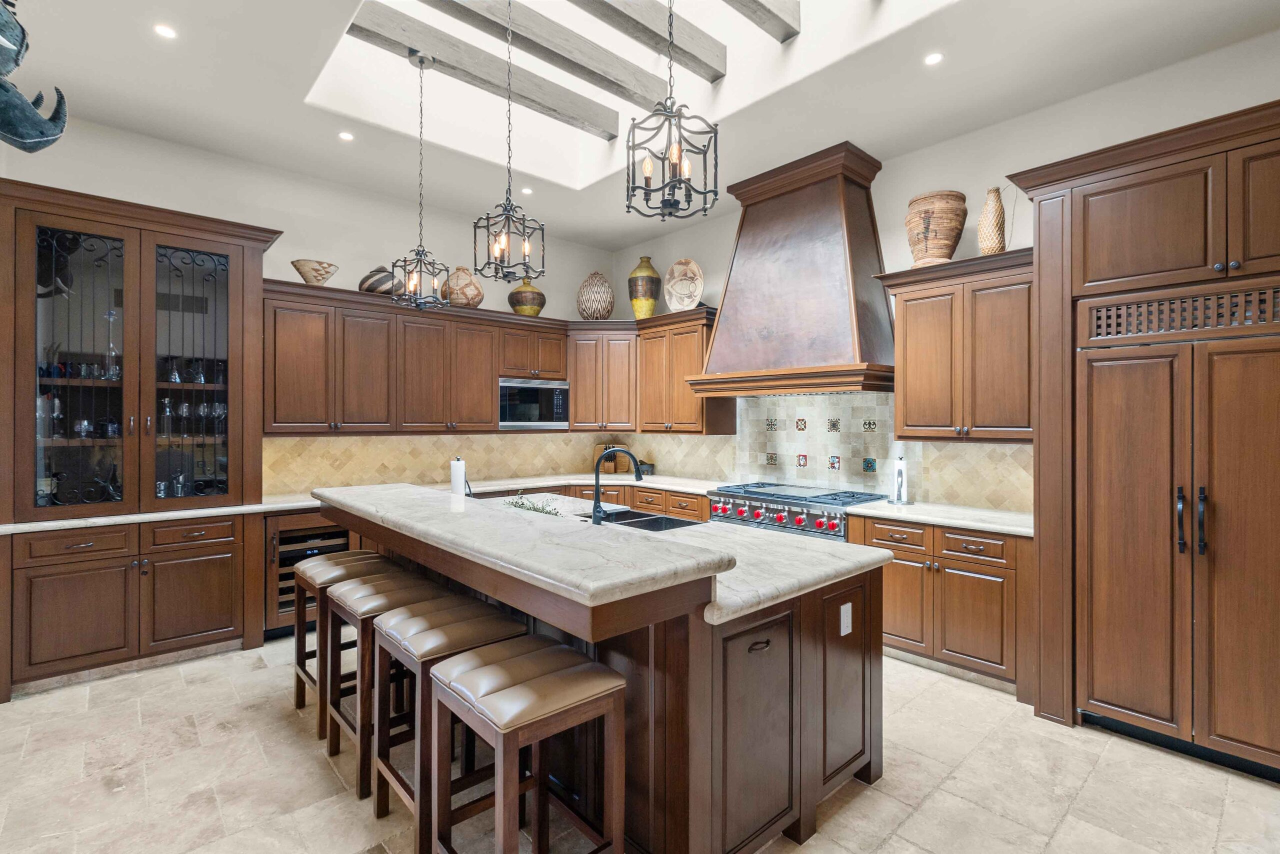 Culinary Excellence: The fully-equipped kitchen features Wolf and Sub Zero appliances, two dishwashers, ice machine, walk-in pantry, dining bar and seated work station. Adjacent great room features seated dining for eight.